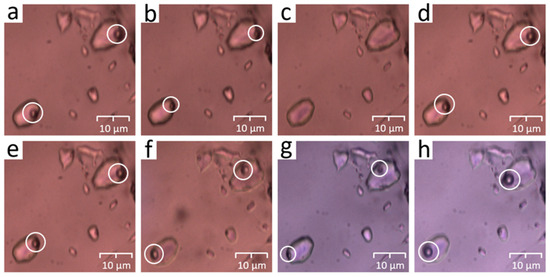 Schematic diagram of the homogenization temperature (a–d) and melting temperature (e–h) measurements of fluorite fluid inclusions (The bubbles within the inclusions have been circled in white in the figure.).