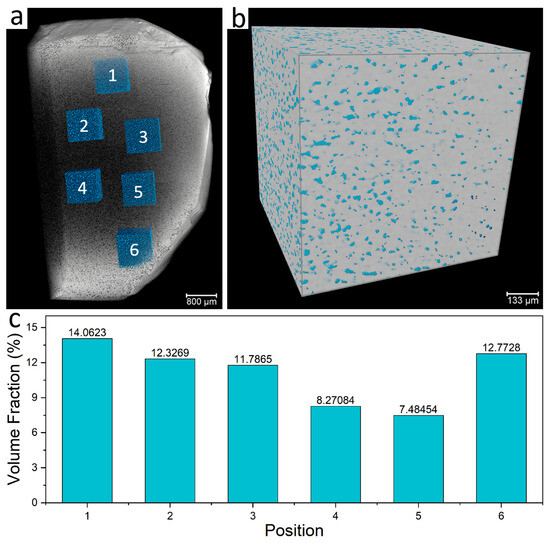 The three-dimensional (3D) tomography structure of fluorite is illustrated in Figure 5, where a reconstruction area measuring 850 × 850 × 850 μm3 was established to analyze the spatial distribution characteristics of fluid inclusions within fluorite (Figure 5b). The blue region represents the low-density area, indicating the 3D spatial distribution of fluid inclusions. Statistical analysis reveals that the spatial distribution density of fluid inclusions within fluorite reaches an impressive 14.1%, with an average occurrence rate of 11.1%, suggesting a significant abundance of fluid inclusions.