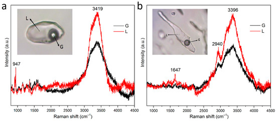 Laser Raman spectra of fluid inclusions in fluorite ((a) original fluid inclusions; (b) secondary fluid inclusions).