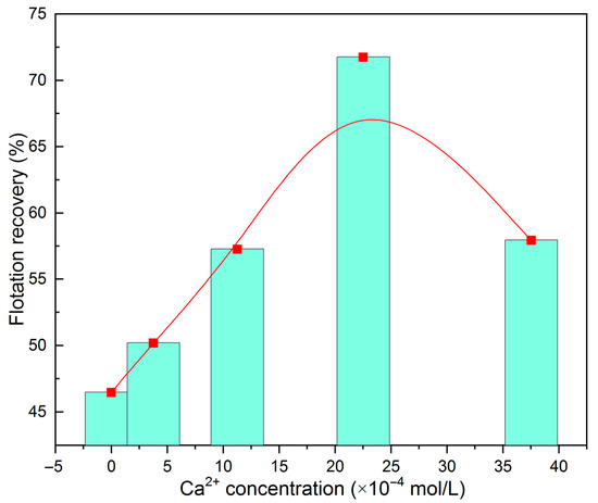 The representative sample used in this study was fluorite powder with a particle size of 45 to 74 μm, and the CaCl2 electrolyte solution served as the source of Ca2+ for the pulp. Figure 7 illustrates the effect of Ca2+ concentration on fluorite flotation behavior in a neutral pulp environment when the collector sodium oleate was present at a concentration of 6.0 × 10−5 mol/L. It can be observed that as the concentration of Ca2+ in the pulp solution increased from 0 to 37.5 × 10−4 mol/L, the flotation recovery rate of fluorite initially increased and then decreased. The highest flotation recovery rate (71.8%) was achieved when an amount of Ca2+ addition equal to 22.5 × 10−4 mol/L was used, which was approximately 25 percentage points higher than that without any Ca2+ addition. This indicates that within a certain range, adding Ca2+ has an activating effect on fluorite flotation. However, a further increase in Ca2+ concentration led to a decrease in the flotation recovery rate due to excessive reaction between Ca2+ and sodium oleate, resulting in the consumption of the collector and a reduction in its concentration within the solution, consequently inhibiting the adsorption of sodium oleate onto fluorite mineral surfaces. Additionally, based on our investigation into fluid inclusion components released by fluorite minerals, it is worth noting that even at solid concentrations as low as 10%, ion component concentrations introduced through inclusion release reached magnitudes of around 10−4 mol/L (Table 3). These released components become unavoidable ions within the pulp solution and significantly impact mineral flotation.