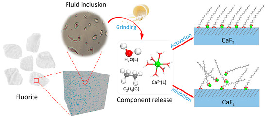 In addition to the surface dissolution of fluorite minerals, the primary source of ions in the pulp solution is attributed to the release of fluid inclusion components within fluorite mineral particles. Among these released ion components, Ca2+ plays a particularly significant role. Consequently, extensive investigations have been conducted on the influence of Ca2+ on fluorite flotation behavior. Building upon this research, we provide a concise analysis regarding the mechanism and significance of fluorite fluid inclusion and its component release on fluorite flotation.