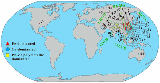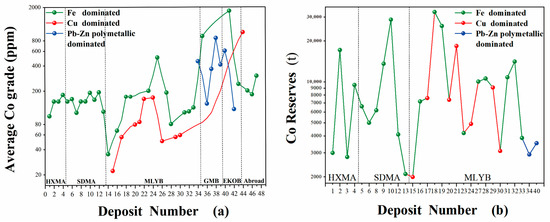 Although skarn-type deposits represent significant hosts for Co resources [24,25], notable variations in Co grade and reserves are observed among different deposits. According to the Comprehensive Exploration and Evaluation Specification for Mineral Resources (GB/T 25283-2023) [26], the boundary grade for the comprehensive utilization of associated cobalt is 100 ppm. This study summarizes relevant data on associated Co resources from 42 skarn-type deposits and classifies these deposits into three subtypes for comprehensive assessment: Fe-dominated, Cu-dominated, and Pb-Zn polymetallic deposits (Figure 1 and Figure 2).