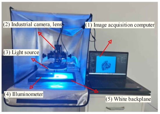 The core of visual sorting systems lies in image acquisition quality, where light source spectrum and illumination intensity are key parameters determining feature contrast [17,18]. Regarding light source coloration, a combination of red (R), green (G), and blue (B) LED lights provides rich spectral information, which helps to distinguish minerals with different colors and compositions [19,20,21]. Meanwhile, the control of illumination is also very important [22,23,24], that is, appropriate illumination enhances the contrast and clarity of the image, while excessive or insufficient illumination can compromise the image quality.