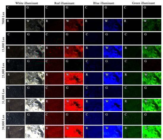 Local sub-images of comprehensive coal gangue under illuminance with different light sources (C—residual coal; G—gray gangue; R—red gangue; W—white gangue).