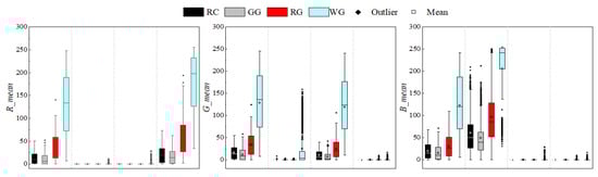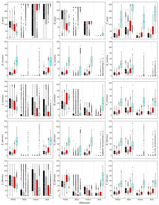 Figure 3 shows the box statistics of color characteristics of different coal gangue types under different colored light sources. The results reveal distinct variations in color channel metrics (mean, variance, and skewness) across coal gangue mineral images under different lighting conditions. RC exhibited lower RGB mean values across all illumination sources, while WG demonstrated higher RGB mean values. These differences stem from the reflective properties of mineral surfaces, with light source color directly influencing surface color perception. The red channel’s mean value (r_mean) became more pronounced under red lighting. GG exhibited similar coloration to RC, making them difficult to distinguish. Considering these findings in combination with Figure 2 and statistical analysis of RGB channel variance and skewness, it is evident that WG displayed more prominent highlights and color dispersion, exhibiting richer details and variations compared to other gangue samples. RC, GG, and RG showed overall dimmer tones with more shadows and more uniform color distribution. These variations were further amplified by corresponding channel characteristics under specific colored light sources.