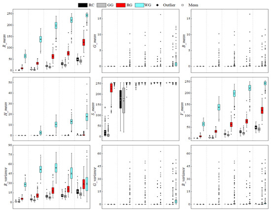 Regarding the color features, the color moments can effectively represent the concentration trend and dispersion degree of the image color. In this study, images were converted into RGB color space and HSV color space, and numerical moments were calculated for each color channel in each color space, including first-order moment (mean), second-order moment (variance), and third-order moment (skewness).