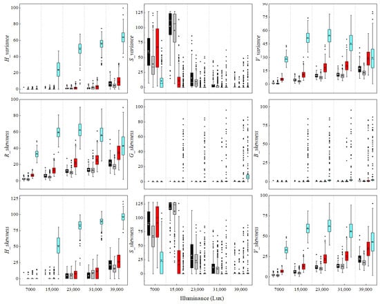 The statistics of texture features for four types of coal gangue under different light sources and illumination intensities (white light source) are presented in Figure 5 and Figure 6, respectively.