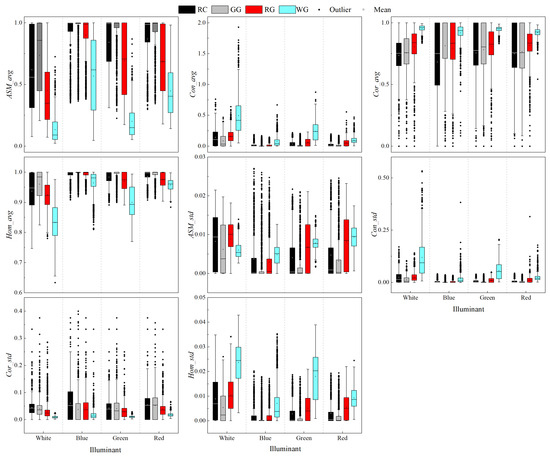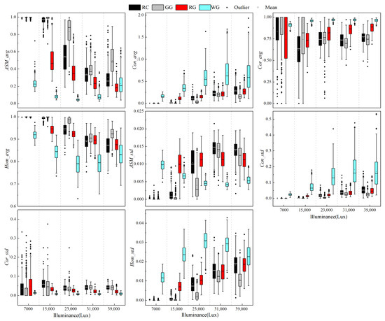 Based on the influences of different light intensities under white light illumination shown in Figure 6, the response relationship between illuminance and texture characteristics of coal gangue was observed. The ASM_avg gradually decreased for RC, GG, and RG; only under high illuminance did they display complex and clear textures. The ASM_avg of WG exhibited a U-shaped change—initially decreasing and then increasing—with medium illuminance being most conducive to revealing the complexity of surface texture structures. The Con_avg values of all coal gangue types exhibited linear growth with increasing illuminance. The trend of Hom_avg values resembled that of ASM, while Cor_avg values showed no discernible pattern.