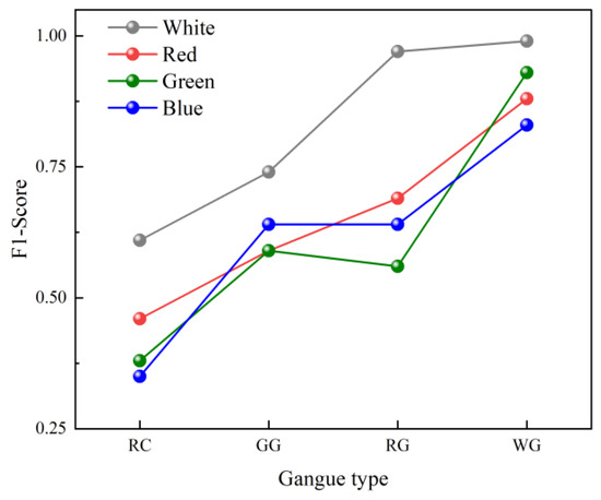 As shown in Figure 7, the selection of the light source significantly impacts the classification performance. The white light source (w) demonstrated overall optimal performance, particularly in distinguishing RG from WG, achieving an F1-Score close to 1. RC proved most challenging, with F1-Scores generally below 0.7, while GG and RG showed intermediate performance. Notably, RG exhibited exceptional classification results under white light sources, followed by red light sources. Therefore, it is recommended to prioritize white light sources for gangue classification. For RC and GG classification, improvements should focus on algorithm optimization or enhanced feature extraction techniques.