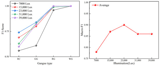 As shown in Figure 8, under white light illumination, the overall accuracy of coal gangue classification shows a trend of first increasing and then decreasing with rising illuminance. At low illuminance levels, the classification accuracy for RC and GG is the poorest. Taking the illuminance factor into account significantly improved the classifier’s recognition accuracy. At moderate illuminance of 23,000 Lux, the Macro-F1 value reached its peak at 0.90, representing a maximum improvement of 15.38%. This demonstrates that by fully leveraging the response characteristics of coal gangue under different illuminances, the performance of the SVM classifier was substantially enhanced.