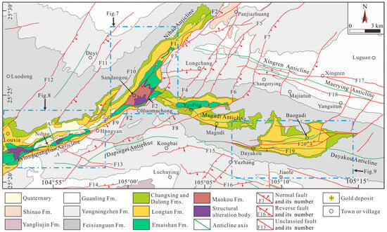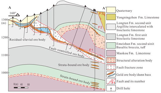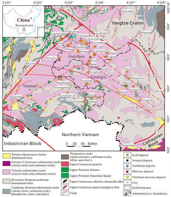 - Su, W.C.; Dong, W.D.; Zhang, X.C.; Shen, N.P.; Hu, R.Z.; Hofstra, A.H.; Cheng, L.Z.; Xia, Y.; Yang, K.Y. Carlin-type gold deposits in the Dian-QianGui “golden triangle” of Southwest China. In Reviews in Economic Geology: Diversity of Carlin-Type Gold Deposits; Society of Economic Geologists, Inc.: Littleton, CO, USA, 2018; pp. 157–185. [Google Scholar]