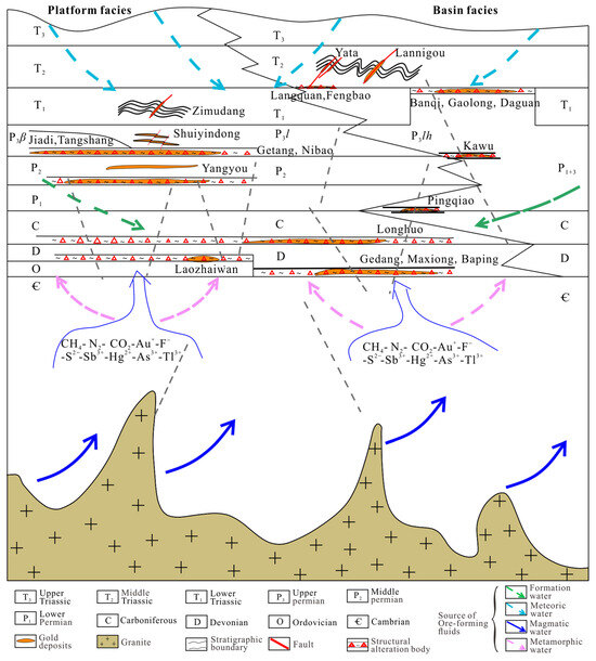 - Su, W.C.; Heinrich, C.A.; Pettke, T.; Zhang, X.C.; Hu, H.R.; Xia, B. Sediment-hosted gold deposits in Guizhou, China: Products of wallrock sulfdation by deep crustal fluids. Econ. Geol. 2009, 104, 73–93. [Google Scholar] [CrossRef]