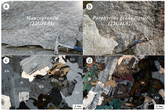 The monzogranite (Figure 5a,c) exhibits a flesh-red color, with a medium-to-fine-grained texture and massive structure. It is primarily composed of plagioclase (~35%), potassium feldspar (~30%), quartz (~25%), and biotite (~10%). The porphyritic granodiorite (Figure 5b,d) exhibits a grayish-black hue, featuring a porphyritic texture and massive structure. Phenocrysts account for 20% of the rock mass and consist of plagioclase (~10%), quartz (~6%), biotite (~2%), and hornblende (~2%). Matrix (~80%) shows fine-grained texture and is composed of plagioclase, K-feldspar, quartz with minor biotite and hornblende.
