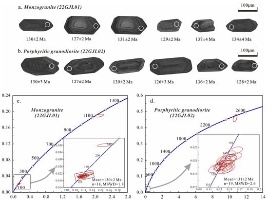 The zircon U-Pb dating results for the Guojialing monzogranite (22GJL01) and porphyritic granodiorite (22GJL02), obtained via LA-ICP-MS, are summarized in Table 1 and graphically represented in Figure 5 and Table 2. The zircon grains analyzed in both samples predominantly exceed 100 μm in length, display euhedral morphology, and exhibit transparency. Cathodoluminescence (CL) imaging further reveals well-developed columnar textures and oscillatory zoning patterns (Figure 6a,b). The Th/U ratios for zircons in 22GJL01 and 22GJL02 range from 0.45 to 0.77 and from 0.47 to 0.89, respectively, consistent with their magmatic origins (Table 2; [37,38]).