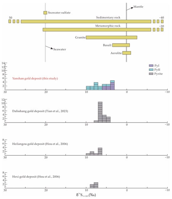 The in situ sulfur isotopic values of the Yanshan gold deposit range from 3.21‰ to 9.77‰ (average 6.08‰), with a relatively concentrated distribution; these values are higher than those in the mantle (δ34S = 0, with a range of 0 ± 3‰), indicating that the sulfur source is not entirely derived from mantle-derived magma (Figure 7). Research has shown that the δ34S values in euhedral–subhedral pyrite grains range from 3.21‰ to 5.35‰, with an average value of 4.30‰; meanwhile, the sulfur isotopic values in subhedral–anhedral pyrite grains range from 6.32‰ to 9.77‰, with an average value of 8.04‰. This suggests that during the early stages of mineralization, the ore-forming material originated from the mantle or magma, with later-stage contributions from host rocks. The sulfur in ore-forming fluids mainly originates from magmatic rocks with high δ34S values (3.57‰–9.77‰) [63] or from the occurrence of high-oxygen mantle degassing in subduction zones [64]. Therefore, the ore-forming materials of the Yanshan gold deposit are primarily derived from magma or the mantle, with some admixture of crustal material. The δ34S values of other gold deposits in the Qixia–Penglai mineralization belt are listed in Table 3. The δ34S values of the Daliuhang gold deposit range from 4.82‰ to 7.04‰, with an average value of 6.12‰ [39]; those of the Heilangou gold deposit range from 6.3‰ to 9.5‰, with an average value of 7.48‰ [40]; and those of the Hexi gold deposit range from 7.4‰ to 8.5‰, with an average value of 7.8‰ [40]. Therefore, the sulfur isotopic values of the Yanshan gold deposit are lower. The main reasons for this may be the dominant contribution of early low δ34S mantle/magmatic sulfur, contamination of the crustal wall rock, and differences in sulfur isotope fractionation during ore-forming fluid evolution. However, the range in the δ34S values (3.21‰–9.77‰) of the Yanshan gold deposit generally overlaps with that of the Daliuhang (4.82‰–7.04‰) and Heilangou (6.3‰–9.5‰) gold deposits, indicating that the mineralization of these gold deposits is related to magmatic activity.