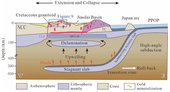 Schematic cartoon diagrams showing Mesozoic geodynamic evolution in the Jiaodong Peninsula of China at ca. 120 Ma (modified after [87]). The black arrows in the figure represent strong mantle convection, resulting in asthenospheric upwelling and intensified lithospheric delamination. The orange arrows represent the sulfur-rich fluids released from the stagnant oceanic slabs. The red lines indicate rising magmas, and the white lines indicate the trajectory of the Paleo-Pacific Oceanic Plate (PPOP). The gray dashed line represents the upper and lower limits of the transition zone. MCLM—metasomatized continental lithospheric mantle; NCC—North China Craton; TLF—Tan-Lu Fault zone; UHP—ultrahigh pressure; WYF—Wulian-Yantai Fault; YC—Yangtze Craton.