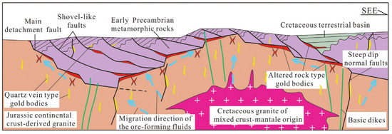 The tectonic basement of the Jiaodong Peninsula comprises Proterozoic metamorphic and Mesozoic intrusive rocks [64]. Since the Jurassic, the superimposition of the ancient Pacific tectonic system has led to the partial melting of the lower crust beneath the Jiaodong Peninsula, triggering large-scale Mesozoic magmatic activity [89]. A series of Mesozoic magmatic rocks dominated by monzogranites and granodiorites was formed from west to east [3]. In the Late Early Cretaceous (120 ± 5 Ma), the entire Jiaodong region was in an extensional tectonic environment due to the retreat of the subducting Pacific Plate (Figure 8) [90]. Lithospheric thinning and mantle material upwelling, along with strong interactions between the crust and mantle, led to the formation of hydrothermal fluids with crust–mantle mixing characteristics [86]. Extensional faults provide not only a good channel for ore-forming fluid migration but also function as a favorable space for ore-forming fluid enrichment and orebodies. The ore-bearing structure of the quartz vein-type gold deposit is opposite to that of the altered rock-type gold deposit (Figure 9). The quartz vein-type gold deposit is mainly controlled by a steep-dipping fault (Figure 9). The relatively steep dip fault is the expansion zone, which is a favorable section for quartz vein-filling. The decompression space is easily formed in the extensional shear segment of the main fault or in secondary extensional or tensional shear faults, in which the ore-forming fluid is filled with ore-forming minerals [91] under the action of pumping, forming quartz vein-type gold deposits.