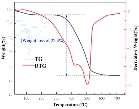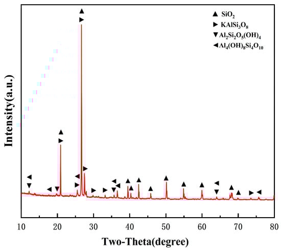 The coal gangue is extracted from several large-scale coal mines in Ordos, and the main mineral composition includes quartz (SiO2), kaolinite (Al2Si2O5(OH)4), feldspar (KalSi3O8), a small amount of pyrite (FeS2), and mica (Kal2(AlSi3O10)(OH)2). Its mineralogical characteristics are identified by XRD, as shown in Figure 1. The main elemental composition and proximate analysis results are listed in Table 1. In addition, the thermal decomposition behavior of the raw coal gangue is illustrated in Figure 2. According to the analysis, it can be classified as a typical high-silica–alumina coal gangue.