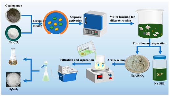 Process flow diagram of additive-assisted activation of coal gangue and efficient extraction of silicon and aluminum elements.