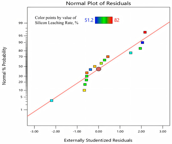 Normal probability plot of residuals. Different colors of the boxes represent the silicon leaching rate (%) of each experimental run, as indicated by the color scale.