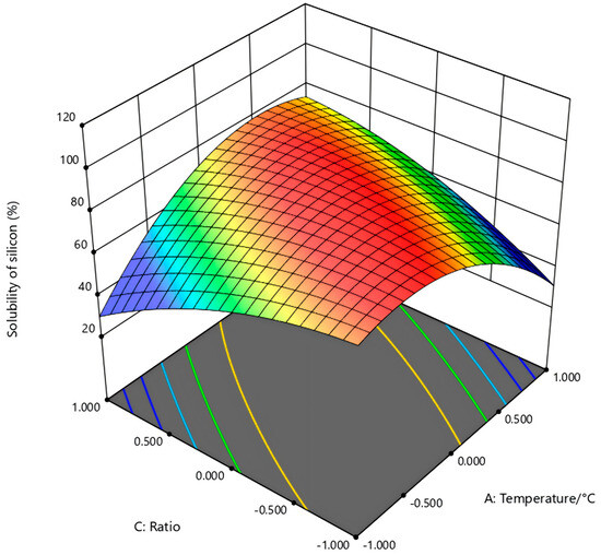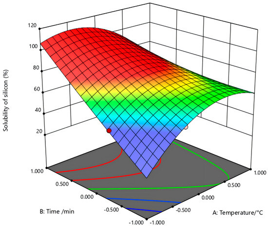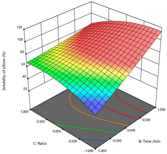 In the figure (Figure 6) of temperature (A) and sodium carbonate ratio (C) to the silicon dissolution rate, at a fixed activation time of 30 min, the silicon extraction rate increased significantly as the sodium carbonate ratio rose from 0.4 to 0.8. However, further increasing the ratio led to a decline in extraction efficiency. The change process explains that the excess of additives does not enhance the activation effect. It is speculated that the generated product may be wrapped around the surface, hindering ion leaching, thereby leading to a decrease in the silicon dissolution rate. This reflects a typical nonlinear response to the alkali ratio; the optimum is located near 800 °C and a gangue:Na2CO3 ratio of 1:0.8.