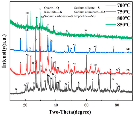 As shown in Figure 8, after activation at 700 °C, the sample is mainly composed of quartz, sodium carbonate, a very small amount of kaolinite, and nepheline phases. The diffraction peaks are very obvious, indicating that at this temperature quartz minerals have not been involved in the reaction, but kaolinite has been basically decomposed into amorphous metakaolin. When a very small amount of the nepheline phase is generated, the reaction has just begun. With the activation temperature increasing to 750 °C, the main peaks of nepheline and quartz began to weaken. The characteristic peak of kaolinite can no longer be seen, meaning that at this moment, kaolinite has been decomposed completely. At the same time, the peak of sodium carbonate decreases remarkably as well. Sodium silicate peaks also appeared, which may be related to the reaction of part of the quartz and sodium carbonate. When the activation temperature is 800 °C, the main phase is the nepheline phase and sodium silicate. The characteristic peak is obvious and a crystallization effect is great. There exists a very small number of weak quartz peaks. Other peaks can hardly be seen. These results indicate that the aluminum–silicon structure has been completely destroyed and involved in the reaction, and the activation effect is good [37].