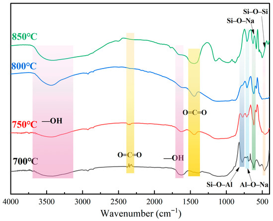 In order to further verify the structure transformation process of XRD analysis, FTIR tests are carried out on the products at different calcination temperatures (700–850 °C) and the results are shown in Figure 9. With the increase in the activation temperature, the stretching vibration peaks (structural water) at 3690–3200 cm−1 and the H-O-H bending vibration peaks at 1630 cm−1 gradually weaken. These peaks have almost disappeared at 800 °C. These characteristics indicate that the structural hydroxyl group is removed: Starting from 750 °C, the typical Si-O-Na bond and Al-O-Na bond absorption peaks appear in the sample, indicating that at this time the nepheline phase and sodium silicate begin to form, and the higher the temperature rises, the stronger the vibration peaks become. The typical quartz Si-O-Si vibration peaks weaken at 800 °C, meaning that with the temperature rising, quartz and sodium carbonate react and generate sodium silicate. At the same time, when the temperature increases, the O=C=O vibration peaks weaken, but also verify that sodium carbonate gradually decomposes and becomes involved in the reaction. When the temperature reaches 850 °C, the absorption peaks of the low-wavenumber bands become broader and even merge, which verifies the formation of disorder and the diversity of the amorphous structure and reflects the reconstruction of the crystal structure and the migration of the components [37].