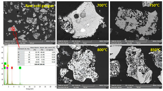 Field emission scanning electron microscopy analysis is carried out on the raw coal gangue and activation products at different temperatures (700–850 °C) to observe the microstructural characteristics of the sample surface during the activation process and further activation mechanism. Its micro-morphology is shown in Figure 10. First of all, the morphological features of coal gangue raw ore are mainly irregular limp ore and a dense surface. A variety of minerals are consecutively embedded, and the monomer’s degree of dissociation is low. From the Energy Dispersive Spectroscopy (EDS) analysis, it can be seen that coal gangue is mainly composed of O, Si, Al, and Fe. It is apparent that its main minerals are kaolinite, quartz, and a small trace of iron pyrite. When the activation temperature reaches 700 °C, the gangue sample’s surfaces expand and attach sodium ions and there is deposition on part of the sample’s surface, suggesting that, at this time, kaolinite has been close to the completion of dihydroxylation, and sodium ions begin to combine with the unsaturated defect site’s aluminum atoms as well as silicon atoms in the defective metakaolinite. When the temperature reaches 750 °C, the surfaces of the particles show significant collapse and form a porous structure. At this moment, sodium ions combine with aluminum and silicon, which form new crystals of the nepheline phase. Its structure is relatively loose. At 800 °C, with sodium ions being further eroded, in turn, the internal structure of the mineral is seriously damaged. In addition, the quartz crystals begin to connect with Na ions, generating sodium silicate. After the completion of erosion, the morphology is similar to honeycomb. The surface is porous and loose, and the porosity is obviously enlarged. It shows that at this time Na2CO3 is completely reacted, generating the main crystalline phases Na2SiO3 and NaAlSiO4. At the same time, it releases a large amount of CO2, promoting the formation of a pore structure. When the temperature rises to 850 °C, sodium ions diffuse into the interior of the particles, leading to the breakage and recombination of the Si-O-Al bond. The crystalline phase of NaAlSiO4 breaks down, and the scaffold begins to disintegrate. It can be noticed that the surfaces of partial particles are melted, which ultimately leads to the reorganization of the structure and transformation into an amorphous glassy phase. At this stage, molten glassy phases precipitate on the particle surfaces, leading to densification and pore blockage. Such microstructural changes decrease the accessible surface area and hinder the penetration of the leaching solution, thereby accounting for the reduced dissolution efficiency observed at temperatures above 850 °C. It turns out that the reaction is most active at an activation temperature of 800 C or so, and the generated structure of the crystalline phase is porous and loose, which is conducive to the following leaching and separation of Al and Si.