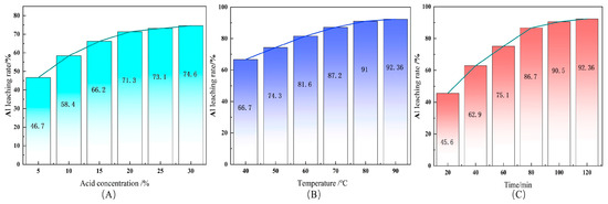 Effects of leaching parameters on Al extraction efficiency: (A) effect of acid concentration on Al leaching rate; (B) effect of leaching temperature on Al leaching rate; (C) effect of leaching time on Al leaching rate.