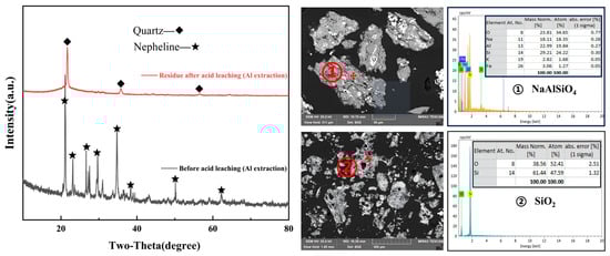 As shown in Figure 11C, with the time extending from 10 min to 120 min, the dissolution rate of aluminum gradually increases. In the first 60 min, it increases rapidly and the reaction is relatively violent. After 60 min, it increases slightly slowly, meaning that the reaction is near the equilibrium point, which belongs to the typical diffusion-controlled leaching. As shown in Figure 12, the phase and morphological evolution of the samples before and after acid leaching clearly confirm the selective dissolution of alumina-bearing minerals under the optimized conditions. The XRD results reveal that nepheline (NaAlSiO4), the primary alumina-containing phase, is almost completely decomposed during leaching, while quartz remains largely unchanged, owing to its chemical stability, indicating that alumina is preferentially extracted and a silica-rich residue is left behind. The SEM observations further support this conclusion: the particle surfaces before leaching are relatively dense and compact, whereas after leaching they exhibit rough, porous morphologies, which can be attributed to the removal of aluminum phases. The corresponding EDS spectra verify a significant reduction in Al content in the leached residue with Si becoming the dominant element, which is in agreement with the formation of SiO2. These findings collectively demonstrate that acid leaching effectively dissolves nepheline and enables efficient aluminum release into solution, while simultaneously enriching the residue with stable silica phases.