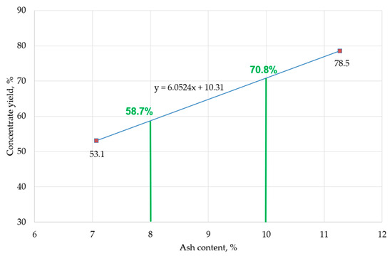 - Hard coal (14–2 mm): A low-ash concentrate was obtained at 53.10% yield with 7.07% ash (layer I). When combining Layers I and II, the concentrate reached 78.52% yield with 11.27% ash. A linear relationship indicated the feasibility of achieving concentrates with 8%–10% ash at ~58.7%–70.8% yield.