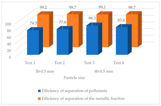 Analysis of the test results showed significant separation efficiency of plastic contaminants ranging from 74.3% to 88.3%. Higher effectiveness achieved during separation tests of the 80–0.5 mm class could result from a greater initial share of easily separated low-density contaminants (<1.5 g/cm3). The separation efficiency of the metallic fraction (particles > 1.8 g/cm3) was very high and exceeded 99% in each test. In most cases, separation efficiency was higher for tests conducted with a lower unit load.