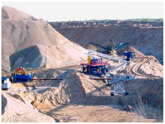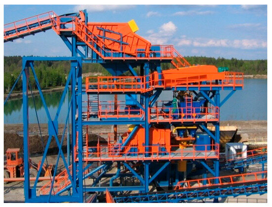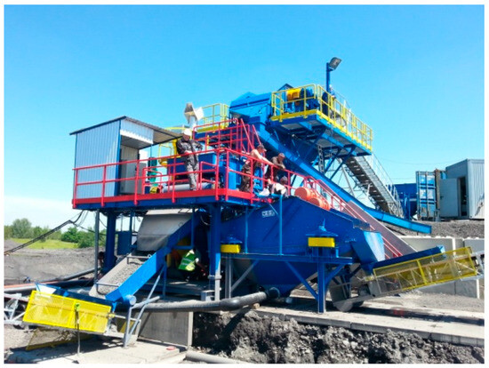 The implementation of pulsating jigs in aggregate processing plants (including in Borzęcin (Figure 6) and near Lublin (Figure 7)) demonstrated high efficiency in material cleaning, including effective separation of organic inclusions and mineral fractions with undesirable technological properties. Ongoing modernisation work and further research enabled the development of the jig design to increase reliability, durability, and efficiency in the cleaning process, especially in the case of feed materials containing a significant share of sand fractions and particles sensitive to alkaline environments (e.g., carbonates) [24,38].