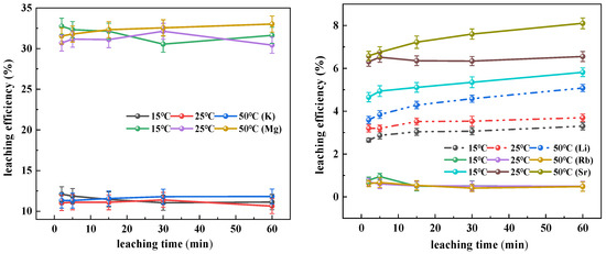 As shown in Figure 1, the leaching efficiency of potassium exhibited minimal temperature dependence, maintaining stable values between 10% and 13% across the tested temperature range (15–50 °C), with no significant temporal fluctuations observed during the 0–60 min leaching period. This behavior indicates rapid attainment of leaching equilibrium, suggesting that potassium primarily exists as soluble salts or easily desorbed adsorbed species on clay mineral surfaces or interlayers, with its leaching process governed by dissolution–diffusion mechanisms rather than temperature-dependent chemical reactions. Magnesium demonstrated generally higher leaching efficiencies, particularly at 50 °C, while showing similarly time-independent leaching patterns across all temperatures. In contrast, lithium and strontium exhibited gradual but limited increases in leaching efficiency with both elevated temperature and prolonged duration, reflecting their predominant occurrence within stable silicate lattices (e.g., kaolinite, chlorite) that resist efficient extraction through thermally driven dissolution alone. Rubidium displayed negligible leaching (<1%) throughout all conditions, with minimal response to parameter variations, confirming its isomorphic substitution into highly stable mineral phases that remain essentially unleachable in pure aqueous systems.