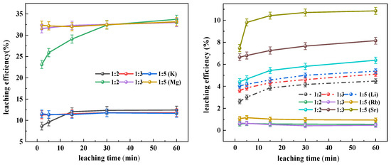As shown in Figure 2, at 50 °C, a solid-to-liquid ratio of 1:2 was observed to enhance the initial magnesium leaching, although the final magnesium leaching efficiency showed limited dependence on the solid-to-liquid ratio. Potassium exhibited consistently low leaching efficiencies with minimal variations across different solid-to-liquid ratios and leaching durations, confirming that the occurrence states of elements constitute the predominant factor governing leaching differences. For lithium and strontium, positive correlations were identified between leaching efficiency and both increased solid-to-liquid ratios and prolonged leaching times, though the absolute improvements remained modest. Rubidium leaching efficiencies demonstrated negligible variations with changing solid-to-liquid ratios or leaching durations, providing further evidence that the leaching processes of lithium, strontium, and rubidium are primarily constrained by their host mineral lattices rather than being solution-concentration-dependent.