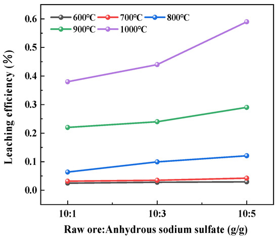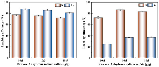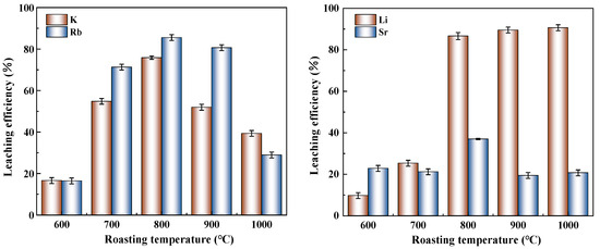 Figure 4 presents the leaching efficiencies of various elements under different ore-to-salt ratios at a fixed roasting temperature of 800 °C for 4 h. As shown in Figure 4, the maximum leaching efficiencies for K (77.67%) and Rb (87.82%) were achieved at an ore-to-salt ratio of 10:1, with both elements exhibiting decreasing extraction trends as the ratio increased (indicating higher Na2SO4 dosage). This inverse correlation suggests that lower salt concentrations enabled the leaching of K and Rb by promoting more complete reaction conditions. In contrast, Li and Sr demonstrated a different pattern, with their leaching efficiencies initially increasing before decreasing, peaking at an intermediate ore-to-salt ratio of 10:3. This phenomenon occurs because an appropriate amount of sodium sulfate reacts effectively with silicate minerals in the raw ore to form more soluble lithium- and strontium-bearing phases, while excessive sodium sulfate leads to excessively high Na+ concentrations in the system, resulting in the formation of insoluble sodium silicate salts that inhibit Li and Sr leaching.