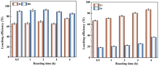 As shown in Figure 5, the leaching efficiencies of K and Rb increased with prolonged leaching time from 0.5 to 2 h, as extended roasting time allowed for more complete reactions between sodium sulfate and minerals, generating increased soluble products. The maximum Rb leaching efficiency (92.91%) was achieved after 2 h of roasting, followed by a fluctuating decrease with further extension, possibly due to the recombination of soluble components into insoluble phases during prolonged roasting. However, K leaching efficiency showed renewed increase after 4 h roasting. In contrast, Li leaching efficiency exhibited continuous growth (from 66.75% to 86.64%) throughout the 0.5–4 h period, indicating its prolonged reaction kinetics where extended roasting time promoted further reactions between lithium-bearing minerals and sodium sulfate. Similarly, Sr leaching efficiency demonstrated gradual improvement (from 18.37% to 36.99%) with increasing roasting duration.