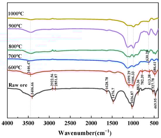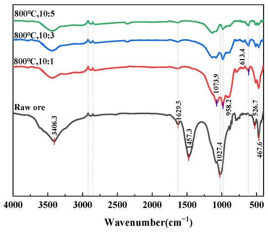 The FTIR spectra clearly reveal the evolution of functional groups in clay-type lithium ore from raw material to samples roasted at different temperatures. As shown in Figure 8, the raw ore exhibited characteristic peaks, including hydroxyl stretching vibrations at 3406.66 cm−1, alkyl C-H vibrations at 2922.56 cm−1 and 2851.87 cm−1, and silicate features around 1032.5 cm−1, reflecting its natural composition containing hydroxyl-bearing minerals (e.g., illite, chlorite) and organic impurities. With increasing roasting temperature (600–1000 °C), the hydroxyl peaks near 3600 cm−1 gradually weakened and eventually disappeared, demonstrating thermal dehydration of hydroxyl-containing minerals (e.g., illite), consistent with the XRD observations showing diminished illite diffraction peaks. In the 2000–1500 cm−1 region, the asymmetric stretching vibrations of carbonate (CO32−) disappeared after roasting due to decomposition (e.g., CaCO3 → CaO + CO2). Significant changes were observed in the 1000–400 cm−1 region, where silicate characteristic peaks (e.g., 1026.87 cm−1) shifted and broadened, while new peaks emerged at 690.28 cm−1 and 660.61 cm−1 above 600 °C, coinciding with the formation of new phases (e.g., forsterite) in XRD patterns and indicating high-temperature-induced silicate lattice rearrangement. At 1000 °C, the spectral features became smoother, suggesting further densification and crystallinity improvement of mineral phases. Figure 9 shows that after 800 °C roasting, samples with different ore-to-salt ratios exhibited varying degrees of hydroxyl peak weakening near 3403.3 cm−1, while in the 1000–400 cm−1 region, the shifting and broadening of silicate characteristic peaks (e.g., 1032.5 cm−1) differed among samples, with more pronounced features of new phases (e.g., reyerite, gloriaite) around 1013.4 cm−1 observed at the 10:5 ore-to-salt ratio.