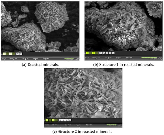 Figure 11 displays SEM images of the minerals roasted at 800 °C with an ore-to-salt ratio of 10:3 for 4 h, showing distinct structural and compositional differentiation. As revealed in Figure 11, the roasted minerals primarily exhibited two characteristic structures. Structure 1 appeared as dense agglomerates enriched with Na and S (Table 1), which, combined with the added anhydrous sodium sulfate and newly formed phases (reyerite, gloriaite) as identified by XRD, were inferred to be complex salt phases generated through reactions between sodium sulfate and calcium/silicon-bearing minerals. The detection of K and Rb indicates the partial migration and enrichment of these elements during roasting. Structure 2 consisted of loosely aggregated needle-like and rod-shaped assemblages, with high contents of Si, Ca, and Mg, suggesting residual silicate phases from the original ore. This structure showed higher Rb enrichment than Structure 1, along with significant carbon content (12.15%), implying the possible formation of complex carbonates through reactions between CO2 (from carbonate decomposition) and elements such as Si and Mg (Table 2). The standard deviation values of element content measurements can effectively reflect their occurrence state characteristics. As evidenced by the data analysis in Table 1 and Table 2, elements with larger standard deviations (e.g., Rb ± 0.86) demonstrate significant distribution heterogeneity within the minerals, which aligns with Rb’s characteristic occurrence as inclusions within clay mineral interlayers. Conversely, elements with smaller standard deviations (e.g., Na ± 0.32) exhibit homogeneous distribution features in mineral phases.