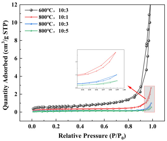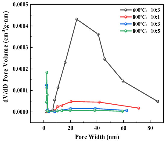 Figure 12 and Figure 13 present the nitrogen adsorption–desorption isotherms and pore size distributions of samples under different roasting conditions, with the structural parameters summarized in Table 3. As shown in Figure 12, all samples exhibited Type IV isotherms, indicating predominantly mesoporous structures (2–50 nm), though some samples also showed macropore (>50 nm) distributions. The H3-type hysteresis loops suggest irregular pore structures formed through interlayer reactions and sintering during roasting. Figure 13 demonstrates that clay-type lithium ore roasted at 600 °C with an ore-to-salt ratio of 10:3 maintained more open mesoporous/macroporous structures, revealing limited mineral sintering and mild reactions between anhydrous sodium sulfate and minerals at lower temperatures. When the roasting temperature was increased from 600 °C to 800 °C at the same ore-to-salt ratio, macropores were reduced and mesopores were refined, with the average pore diameter decreasing from 38.1939 nm to 24.6321 nm, demonstrating that elevated temperatures accelerated mineral reactions and new phase (e.g., sulfates, silicates) formation, leading to sintering-induced densification and significant pore volume reduction. However, the leaching efficiency of all elements at 600 °C was lower than that in the 800 °C group, which indicates that temperature was the core factor affecting leaching under these conditions. At identical roasting temperatures, decreasing the ore-to-salt ratio (increased sodium sulfate dosage) further reduced the average pore diameter from 24.6321 nm to 11.4159 nm and decreased the BET surface area from 1.1126 m2/g to 0.5738 m2/g, indicating more compact new-phase packing with compressed porosity. As a result, the leaching efficiency of K and Rb decreased continuously, which indicates that smaller pores hindered the diffusion and dissolution of K and Rb, leading to a decrease in leaching efficiency. The leaching efficiency of Li and Sr reached a peak at an ore-to-salt ratio of 10:3 and then decreased. This is because when the ore-to-salt ratio was 10:3, the dosage of Na2SO4 was sufficient for the reaction with silicate minerals, while when the ore-to-salt ratio was 10:5, the high salt content led to sintering densification, which inhibited the leaching efficiency. It can be seen that the leaching of Li and Sr not only depended on the diffusion channels of pores but was also affected by the formation of soluble phases through chemical reactions.
