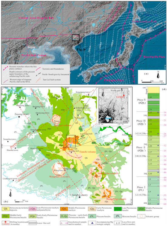 - Zhang, M.; Guo, Z.; Cheng, Z.; Zhang, L.; Liu, J. Late Cenozoic intraplate volcanism in Changbai volcanic field, on the border of China and North Korea: Insights into deep subduction of the Pacific slab and intraplate volcanism. J. Geol. Soc. 2015, 172, 384–399. [Google Scholar] [CrossRef]