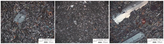 | CZK06-26 | porphyritic, massive | intergranular, Pl (0.4–1.2 mm, major) + Cpx (0.3–0.6 mm, 10%) + Ol (0.1–0.3 mm, 5%) + Mm (0.1–0.3 mm, 3%–4%) | Pl (1.0–4.0 mm, An = 62, 10%–12%), Ol (<1%) | |