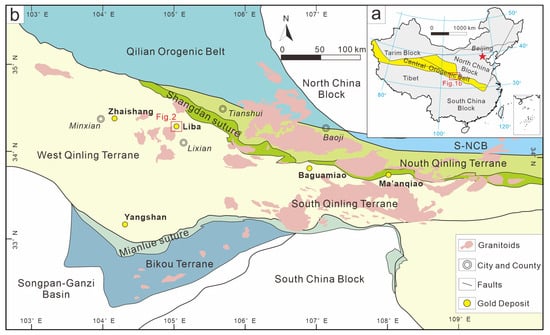 - Huang, J.; Wang, J.Y.; Wei, L.M. Geological characteristics and genesis of the Liba gold deposit, Gansu province. Miner. Depos. 2000, 19, 105–115. [Google Scholar]