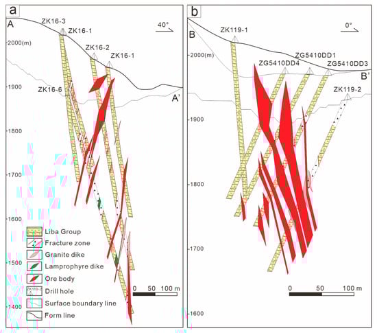 Geologic profile of the Magou line 16 (a) and Zhaogou line 119 (b) in Liba gold deposit (modified after [24]) (location of the sections is shown in Figure 2).