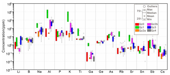 This analysis was conducted based on cathodoluminescence images of quartz grains from each stage (Qz0 to Qz4) to guide the selection of analytical points for the in situ trace element analysis. The results are summarized in Table S1. The test results indicate that the primary trace elements present in quartz include Li, Na, Al, K, and Ti, which exhibit considerable variation in concentration. In contrast, other elements such as Be, Rb, Ga, Sn, and Cs are generally close to or below the detection limit. The variation in quartz trace element concentrations across the different growth stages is illustrated in Figure 6. Specifically, trace element concentrations in Qz0 are generally low, reaching only background levels. Fluid-mobile elements, such as Al, Na, and K, are present in particularly low concentrations. In Qz1, the overall trace element concentrations are markedly elevated, with Na, Al, K, Ti, Ga, Rb, and Sr exceeding those of other phases by at least one order of magnitude. Within Qz2, Qz2a exhibits slightly lower concentrations compared to Qz1, particularly for Na, K, and Rb, and the data are more tightly clustered, indicating reduced variability. In contrast, Qz2b shows significant variability, with a notable enrichment of trace elements, including Al, K, Rb, and Sr, compared to Qz2a. The trace element concentrations in Qz3 are generally lower than those in Qz2, although Li, Na, and Al remain at relatively elevated levels. Qz4 displays substantially reduced trace element concentrations, resembling those observed in Qz0.