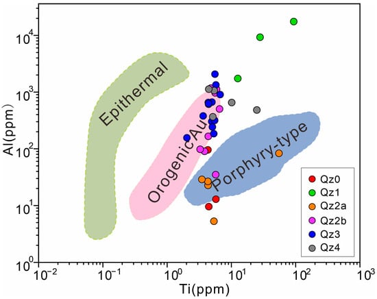In addition, trace element contents in quartz from different deposit types exhibit systematic variations, allowing deposit types to be identified through trace element compositions. Porphyry deposits, orogenic gold deposits, and epithermal deposits can be differentiated based on the Al and Ti contents within quartz from hydrothermal systems [16,41]. Porphyry deposits are characterized by quartz Ti contents ranging from 1 to 200 ppm, Al contents between 50 and 500 ppm, and Al/Ti ratios between 1 and 10. In contrast, epithermal deposits are marked by quartz Ti levels below 3 ppm, Al levels ranging from 20 to 4000 ppm, and Al/Ti ratios spanning from 100 to 10,000. Orogenic gold ore quartz exhibits intermediate values, with Ti contents ranging from 1 to 10 ppm, Al contents typically ranging from 100 to 1000 ppm, and Al/Ti ratios between 10 and 100.