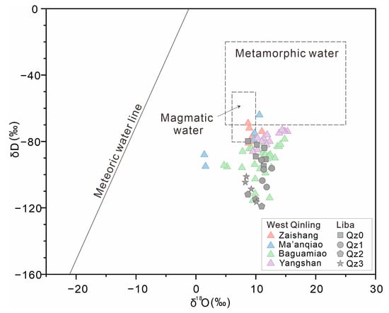 Hydrogen and oxygen isotopic compositions of quartz from the Liba gold deposit and the West Qingling gold deposits (modified after [44]).