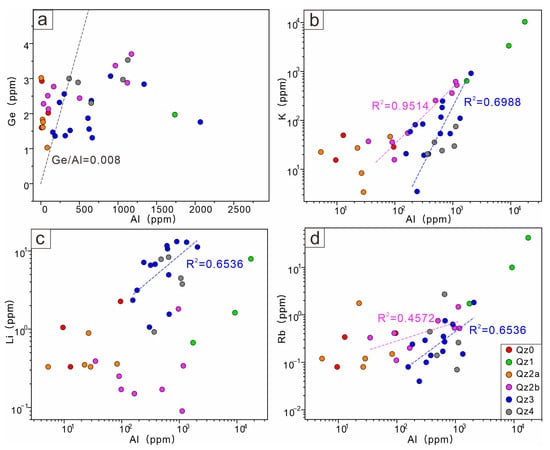 Binary diagrams of trace elements in quartz from Liba gold deposit: (a) Ge vs. Al. (b) K vs. Al. (c) Li vs. Al. (d) Rb vs. Al.