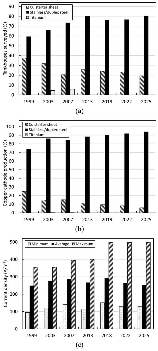 Figure 9 shows selected trends in the adoption of permanent cathode technology from 1999 to 2025, based on operational data collected from global copper electrowinning tankhouse surveys for this period [6,30,31,32,33,34,35]. These data typically represent approximately 40%–50% of world hydrometallurgical copper cathode production; as such, they can be considered indicative of the major industry trends. As shown by comparison of the data in Figure 9a,b, some 20% of surveyed tankhouses still use starter sheets today; however, these are all old tankhouses (commissioned in the 20th century) and contribute a relatively small proportion (<6%) of total survey production. Titanium cathode blanks were employed by two small (<10 kt/a Cu) operations in the 1990s for a short period, but these were never widely adopted owing to their high cost. All new and refurbished tankhouses today employ stainless- or duplex-steel cathode blanks. A wide range of suppliers and designs are now available, in addition to the ISAKIDD and Metso Outotec processes.