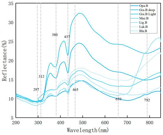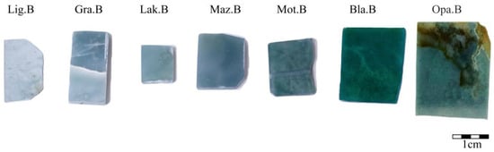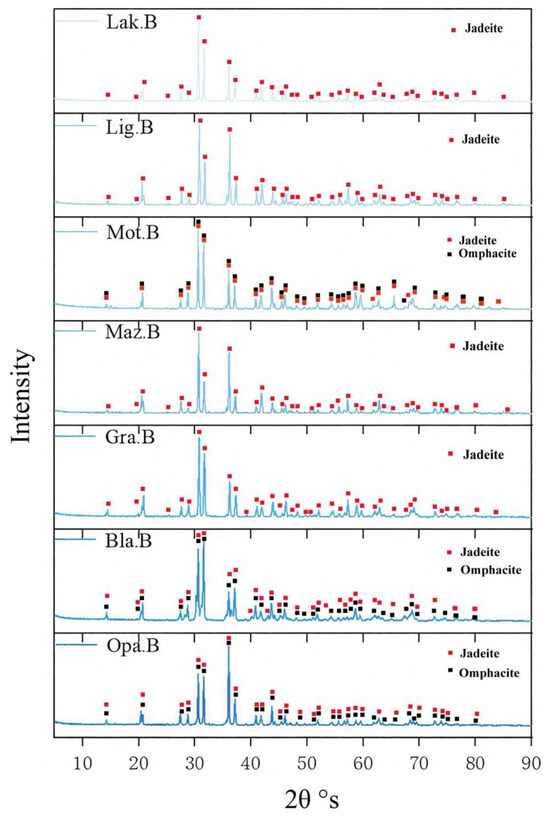 Seven distinct varieties of Guatemalan blue jadeite were characterized by XRD (Figure 3), and strongest peaks are observed in the samples Gra.B, Mot.B, Lig.B, and Lak.B, which correspond well to the reference peaks of the jadeite standards. In contrast, samples Opa.B and Bla.B are primarily composed of omphacite with minor jadeite content. Compared to the jadeite-rich samples, these omphacite-dominant samples exhibit characteristic peak shifts towards lower angles attributable to different crystallographic parameters.